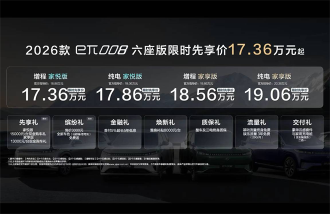 奕起熱愛(ài),派生精彩。8月1日,東風(fēng)奕派汽車(chē)科技公司戰(zhàn)略發(fā)布會(huì)暨新車(chē)發(fā)布會(huì)在武漢隆重舉行,2026款東風(fēng)奕派eπ008六座版煥新上市。新車(chē)在“舒心品質(zhì)、舒心科技、舒心駕控、舒心守護(hù)” 四大維度全面升級(jí),官方起售價(jià)18.86萬(wàn)元起,限時(shí)先享價(jià)17.36萬(wàn)元起,為用戶(hù)帶來(lái)極具誘惑力的超值選擇。8月31日前下定限時(shí)享多重購(gòu)車(chē)權(quán)益,其中無(wú)論是8000元/臺(tái)的置換補(bǔ)貼、整車(chē)及三電終身質(zhì)保基礎(chǔ)權(quán)益,還是至高15000元/臺(tái)先享禮和3000元車(chē)色免費(fèi)贈(zèng)送限時(shí)權(quán)益,都展現(xiàn)出極高的誠(chéng)意。