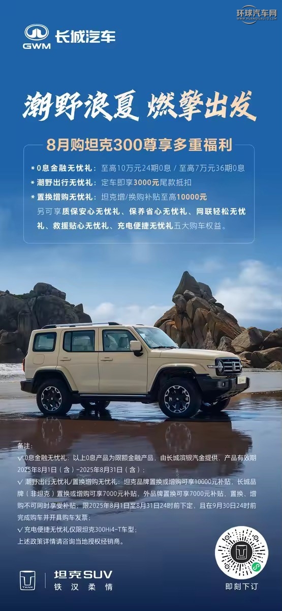 為了滿足廣大用戶的多樣化需求,坦克300還特別推出了置換增購與潮野出行雙重禮遇。2025年8月期間,凡定車用戶,即可享受3000元尾款直抵。同時,坦克品牌車型的置換或增購 更可獲得至高10000元的補貼,長城其他品牌置換或增購可享7000元補貼,外品牌置換亦可享7000元補貼。 該政策限定2025年8月31日24時前下定,并于2025年9月30日24時前完成購車并開具購車發票。這一政策精準滿足您的不同需求,輕松擁有心儀座駕。