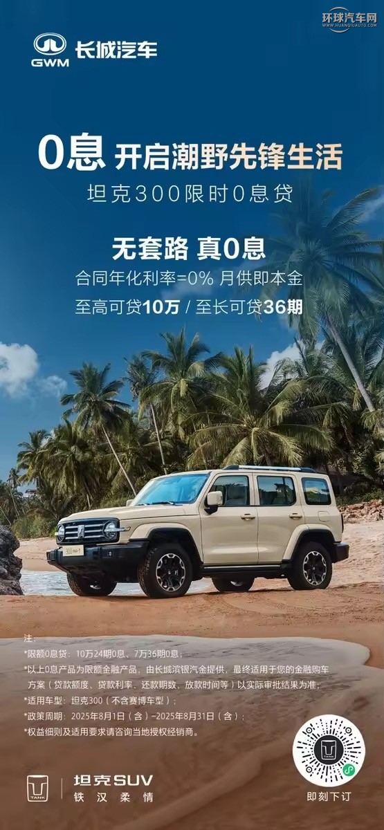 炎炎夏日,正是釋放野性、探索自然的絕佳季節。為回饋廣大用戶的熱愛與支持,即日起至2025年8月31日,坦克300推出“潮野浪夏 燃擎出發”的禮遇活動。“0息金融無憂禮”疊加多重購車及用車無憂權益,讓您即刻駕馭、輕松享受夏日潮野先鋒生活。
