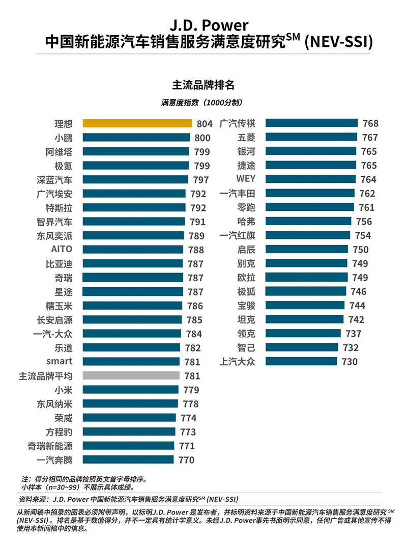 理想以804分獲得主流品牌新能源汽車銷售服務(wù)滿意度冠軍。小鵬(800分)排名第二,阿維塔(799分)與極氪(799分)并列第三。