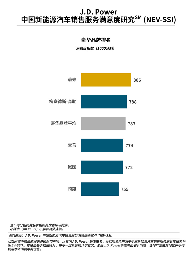 蔚來以806分獲得豪華品牌新能源汽車銷售服務(wù)滿意度冠軍。 梅賽德斯-奔馳(788分)排名第二。
