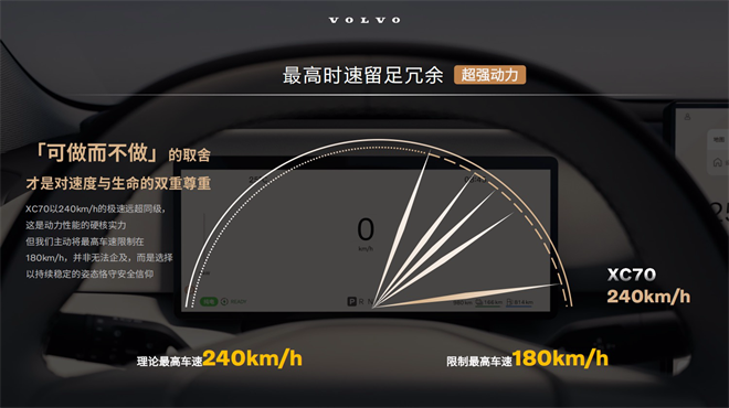 當我以為240km/h極速是性能彩蛋時,沃爾沃反手就主動限速到了180km/h。「動力冗余是尊嚴,速度克制是信仰。」安全白皮書上,再次看到了沃爾沃全新XC70對速度和生命的敬重。