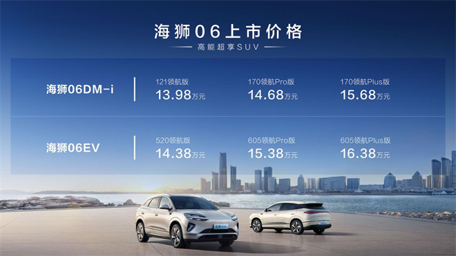 13.98萬元起的官方指導價,讓這臺集高顏值、大空間、長續航(DM-i版 1670km)EV版 (520km或605km)、舒適駕乘和智能科技于一身的中型SUV顯得誠意十足。它所帶來的,正是從城市日常到探索遠方的高品質、無憂慮出行體驗。若你正在尋找這樣一位全能伙伴,不妨親自去感受一番海獅06的魅力。