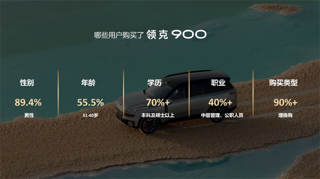 從購車情況來看,領克 900 的增換購率高達 90% 以上,其中近40% 來自 BBA 車主。BBA 車主選擇增換購領克 900 已成為一種趨勢,他們看中的是領克 900 兼具傳統豪華車企的底盤操控、性能與安全,以及新勢力的智能化體驗,使其成為傳統豪車用戶在新能源時代的心智首選。??