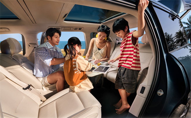 在空間設計上,領克900以5240mm的超長車身為基礎,實現同級罕見的88.2%空間利用率,6.16㎡的超大艙內面積配合第三排1.1米超長坐墊及超寬奢空間,三排六座皆配備加熱、按摩功能,重新定義六座SUV的舒適基準,讓第三排不再將就。SUV中首創的雙180°電動旋轉座椅可將座艙空間一鍵切換為“移動會客廳”,可對坐、可向外90°旋轉、可一鍵成床,搭配電動天地門與兩噸級電動拖車鉤,為用戶解鎖多元戶外生活場景。?