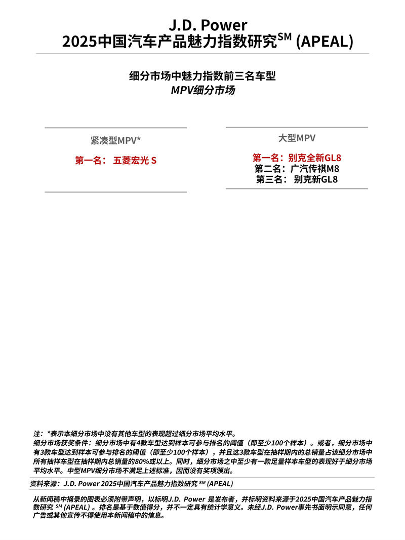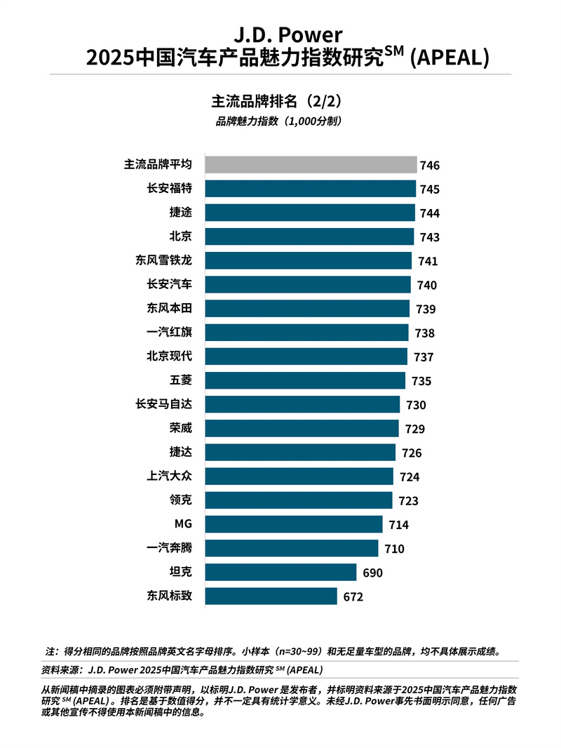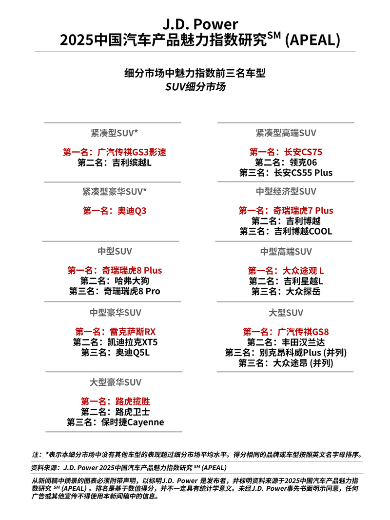 2025年8月14日,上海 — 全球領先的消費者洞察與市場研究機構J.D. Power|君迪今日正式發布2025中國汽車產品魅力指數研究SM(APEAL),這是J.D. Power連續第23年發布這一研究。該研究衡量了燃油車新車車主在購車2至6個月內擁有和駕駛車輛的各方面體驗,從而最終整合出讓新車購買者感到興奮和欣喜的車輛要素設計組合,是汽車廠商設計和開發車輛的重要依據。