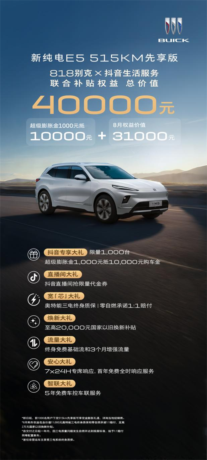 2025年8月16日 正值“別克818購車節”火熱啟幕,新別克純電E5帶來重磅消息:不僅以15億公里零自燃的成績刷新行業紀錄,更推出限量鉅惠禮遇。即日起,別克與抖音生活服務帶來聯合補貼,消費者購買新別克純電E5先享版車型,可享受超級膨脹金1000元定金抵10000元購車金專享大禮,以及至高2萬元置換補貼、奧特能三電終身質保、零自燃承諾1:1賠付、5年免費車控車聯服務等七重大禮,總價值4萬元,限量1000臺。這波超值回饋,為用戶創造了抄底購車的絕佳時機。
