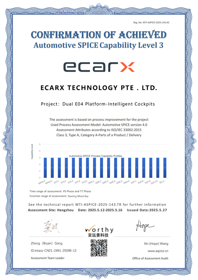 在認證范圍的選擇上,億咖通科技不僅涵蓋了常規(guī)VDA SCOPE的16個核心過程,還額外增加了需求挖掘、風險管理、產品發(fā)布等關鍵流程,以更好地滿足全球車企對質量和可靠性的嚴格要求。2025年5月,億咖通科技順利通過了嚴苛的ASPICE CL3評估認證。
