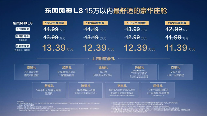 8月29日,在第28屆成都車展上,東風(fēng)新旗艦東風(fēng)風(fēng)神L8正式宣布上市,限時置換價僅需11.39萬元起(可疊加享受國/地補),直接擊穿“25萬元才能配齊冰箱彩電大沙發(fā)”的行業(yè)認知,成為這個級別最具競爭力的舒享座艙之王。
