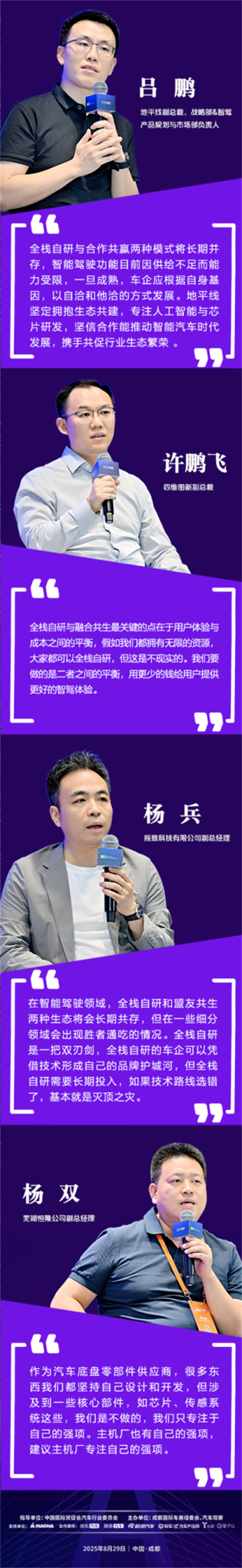 針對(duì)上述產(chǎn)業(yè)生態(tài)關(guān)鍵問(wèn)題,在同濟(jì)大學(xué)汽車學(xué)院教授、汽車安全技術(shù)研究所所長(zhǎng)朱西產(chǎn)的主持下,麥格納斯太爾全球銷售與市場(chǎng)副總裁KurtBachmaier,深藍(lán)汽車軟件開(kāi)發(fā)總經(jīng)理蘇琳珂,MG品牌營(yíng)銷專家陳繼業(yè),地平線副總裁、戰(zhàn)略部&智駕產(chǎn)品規(guī)劃與市場(chǎng)部負(fù)責(zé)人呂鵬,四維圖新副總裁許鵬飛,辰致科技有限公司副總經(jīng)理?xiàng)畋徍懵」靖笨偨?jīng)理?xiàng)铍p展開(kāi)深入探討,從企業(yè)實(shí)踐與行業(yè)趨勢(shì)出發(fā),剖析生態(tài)模式的未來(lái)走向。