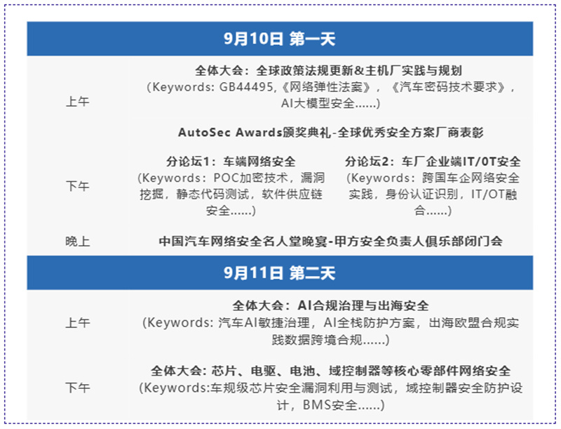 本屆大會以“多場景全鏈路”汽車安全防護為核心脈絡,不僅涵蓋2場主題峰會與多場專題分論壇,更通過AutoSec 安全之星頒獎典禮、名人堂晚宴、全景圖、攻防演練、展商產品展示等特色活動,串聯起從技術研討到產業落地的完整閉環。
