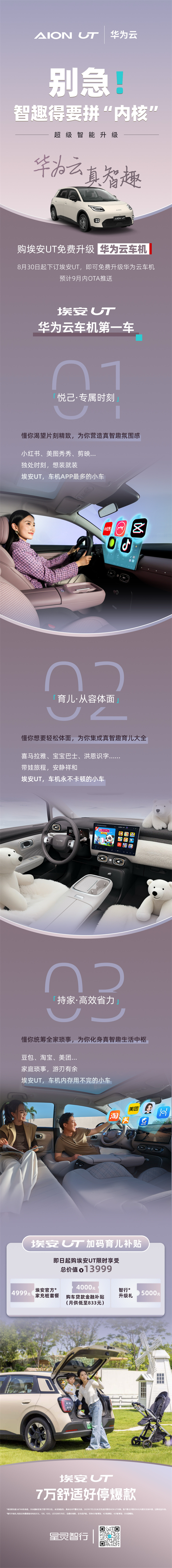 與此同時,埃安UT還積極響應(yīng)國家政策,成為首個落地個人消費(fèi)貸款貼息政策的車型。購車即享總價值13999元的“加碼育兒補(bǔ)貼”,包括價值4999元官方家充樁套餐、價值5000元智行升級禮,以及價值4000元購車貸款金融補(bǔ)貼,月供可低至833元,為中國有孩家庭減負(fù)。