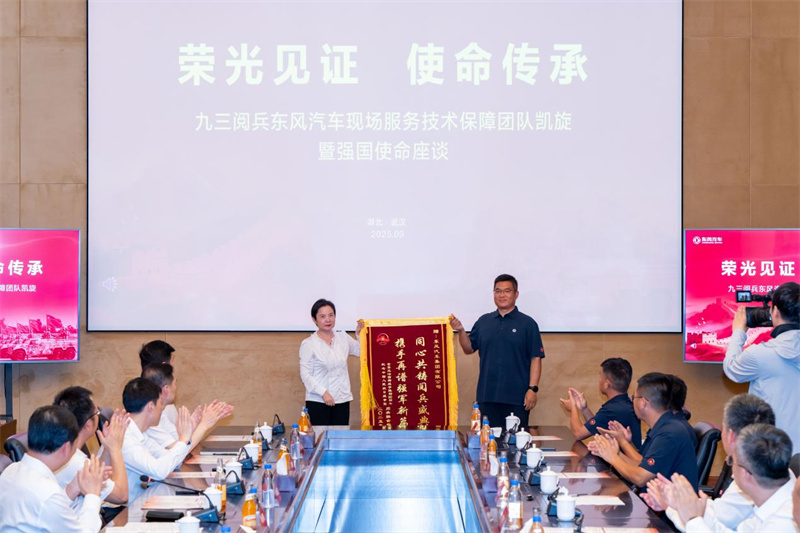 服務國之盛事,必備非常實力。九三閱兵不僅是對東風軍車品質的一次大考,同樣是對東風軍品保障能力的一次檢驗。在紀念中國人民抗日戰爭暨世界反法西斯戰爭勝利80周年大會上,115輛東風軍車以“零失誤、零誤差、零故障、零事故”再次彰顯了“中國軍車第一品牌”的實力與擔當。東風汽車現場服務技術保障團隊也以高標準、高質量、高水平完成任務,贏得閱兵聯合指揮部、受閱官兵的一致好評,獲得閱兵聯合指揮部贈予“同心共鑄閱兵盛典 攜手再譜強軍新篇”錦旗。
