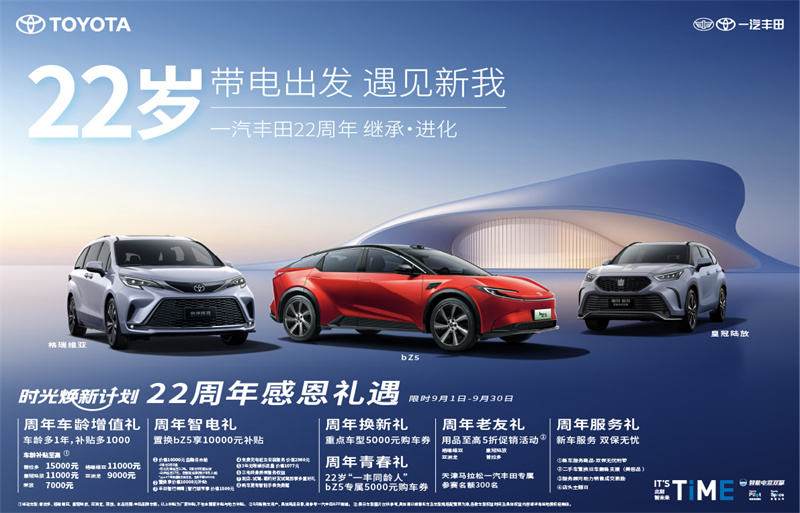 同時,9月26日至10月8日期間,一汽豐田22周年官方直播間將持續抽獎活動,對于皇冠陸放和格瑞維亞車型有至高16000元限定禮。此外,一汽豐田“時光煥新計劃”也將借保值節推出限時權益:自9月起,一汽豐田置換用戶可享至高15000元福利;活動期間,回廠或到店參與以舊換新的客戶還可獲免費車輛評估服務及更多專屬禮遇。