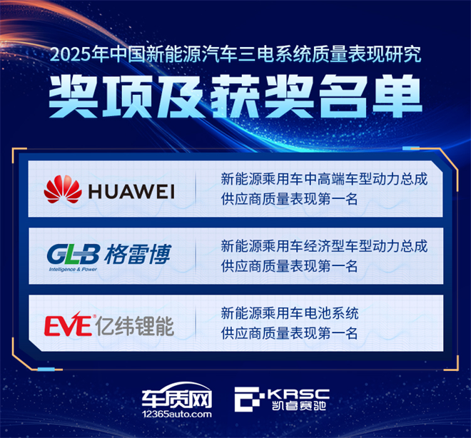 根據(jù)《2025年中國新能源汽車三電系統(tǒng)質(zhì)量表現(xiàn)研究》結(jié)果,主辦方公布了新能源汽車三電系統(tǒng)質(zhì)量表現(xiàn)優(yōu)秀供應商。電池系統(tǒng)供應商質(zhì)量表現(xiàn)第一名和動力總成供應商質(zhì)量表現(xiàn)第一名的獲獎企業(yè),他們在各自領(lǐng)域提供的產(chǎn)品質(zhì)量表現(xiàn)優(yōu)異,精準滿足用戶對高品質(zhì)的追求。