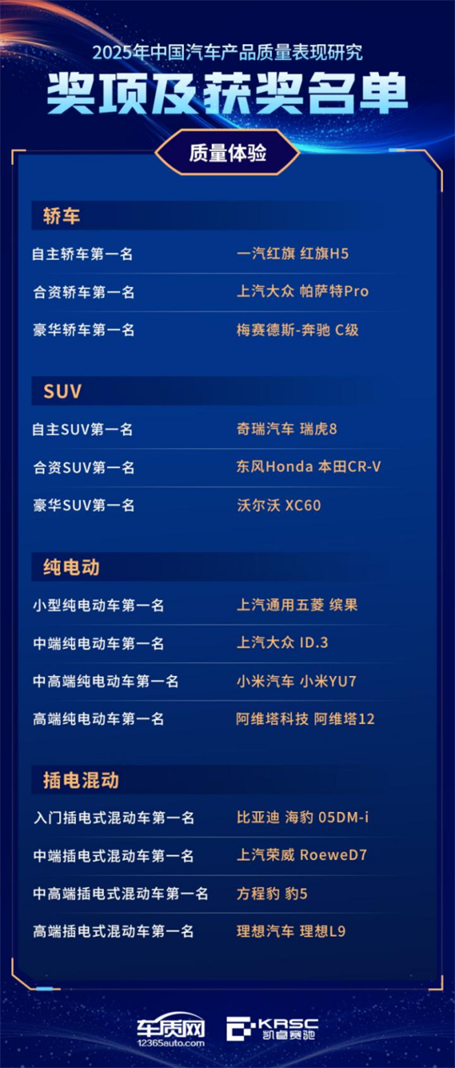 依據(jù)《2025年中國汽車產(chǎn)品質(zhì)量表現(xiàn)研究(AQR)》結(jié)果,主辦方還公布了整車各細分市場質(zhì)量表現(xiàn)及質(zhì)量體驗最佳車型,以及純電動汽車續(xù)航滿意度最佳表現(xiàn)產(chǎn)品。中國汽車產(chǎn)品質(zhì)量表現(xiàn)獎獲獎車型,在產(chǎn)品可靠性與穩(wěn)定性方面領(lǐng)先于細分市場,是對整車在質(zhì)量控制與耐久性方面表現(xiàn)的有力印證。中國汽車產(chǎn)品質(zhì)量體驗獎獲獎車型,在舒適性、便利性、駕乘感受等方面表現(xiàn)卓越,能夠更好滿足消費者核心用車需求。純電動汽車續(xù)航滿意度最佳表現(xiàn)獎獲獎車型,在新能源出行體驗中實現(xiàn)“數(shù)據(jù)表現(xiàn)”與“用戶預期”的高度匹配,是純電動車續(xù)航信心與用戶信賴的雙重背書。
