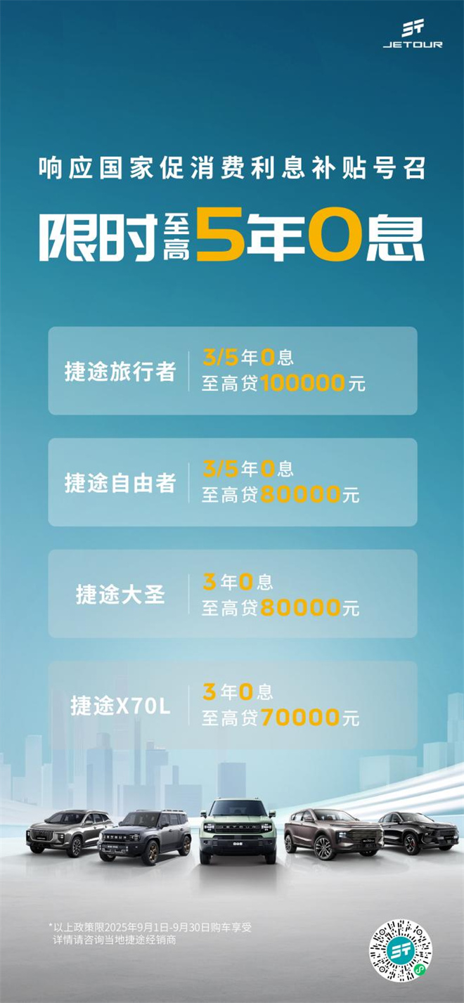 為了讓更多人能即刻開啟“向往的旅行”,捷途汽車9月推出限時鉅惠,方盒子冠軍家族更是誠意拉滿,捷途旅行者可享至高5年0息貸款+6次免費保養,至高可貸100000元。捷途自由者置換補貼高達15000元,至高可貸80000元。