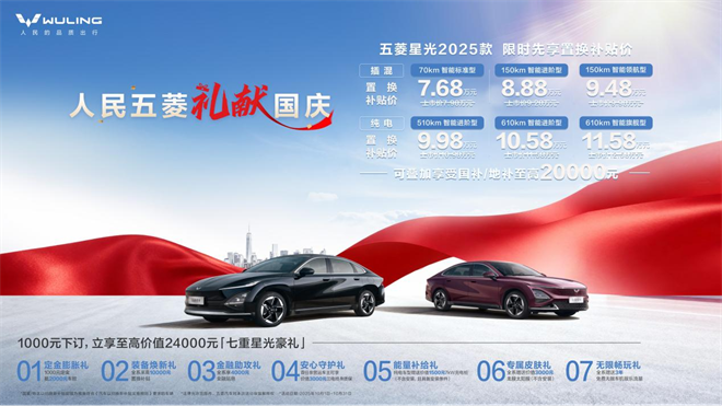 為回饋用戶的信賴與支持,五菱推出「人民五菱,禮獻國慶」購車福利:10月下訂五菱星光,置換補貼價7.68萬元起,可享至高價值24000元「七重豪禮」,包括1000元定金抵2000元車款、全系至高10000元置換補貼、全系享4000元金融貼息等。