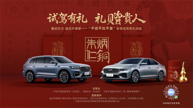 即日起至12月31日,針對購買中國星星瑞全系、星越L全系用戶,每月將在第三方檢測機構(gòu)的監(jiān)督與公證下,抽取300名幸運用戶免費贈送中國星東方曜限量定制款MEIZU 22手機。此外,吉利中國星還攜手中國非遺銅雕文創(chuàng)品牌——朱炳仁·銅,發(fā)起“試駕有禮,禮贈貴人” 不試不比不賣全民試駕有禮活動,到店試駕中國星星瑞、星越L系列車型,即可獲贈由“朱炳仁·銅”匠心打造的【福祿壽喜葫蘆掛件】一份。