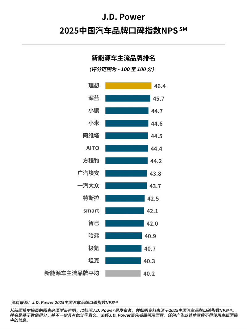 理想以46.4分獲得新能源車主流品牌冠軍。深藍(lán)(45.7分)排名第二,小鵬(44.7分)排名第三。