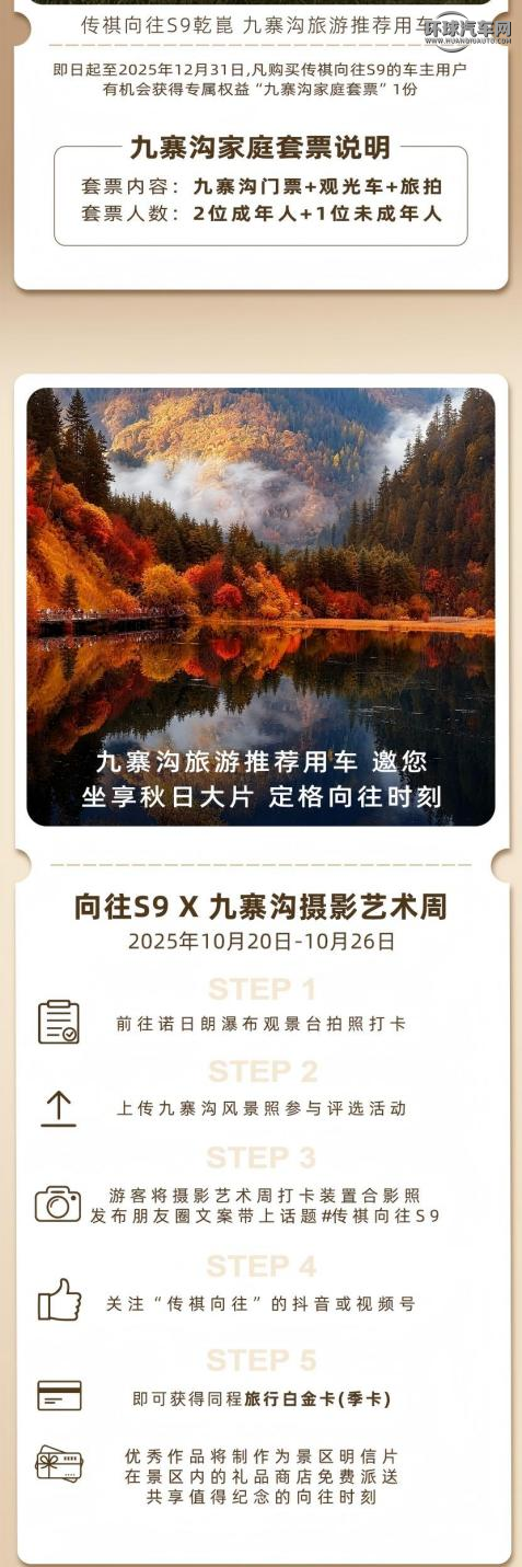10月20-26日,九寨溝攝影藝術周期間,前往諾日朗瀑布觀景臺拍照打卡,并帶上話題#傳祺向往S9分享九寨溝風景照,有機會獲得同程旅行白金卡(季卡)。不僅如此,即日起至12月31日,購買向往S9的車主并在同程旅行APP首頁搜索欄輸入“傳祺向往S9”進入活動頁面參與活動,還有機會獲得專屬權益——“九寨溝家庭套票”,共賞九寨溝秋日絢爛美景,奔赴向往的幸福生活。
