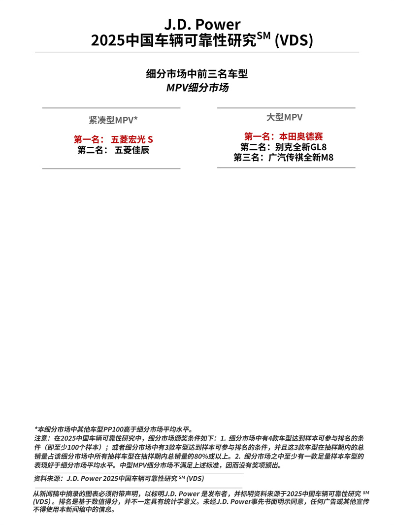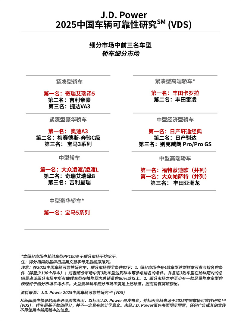 車型層面,共有14個品牌的20款車型在2025年中國車輛可靠性研究中摘得細分市場獎項 。