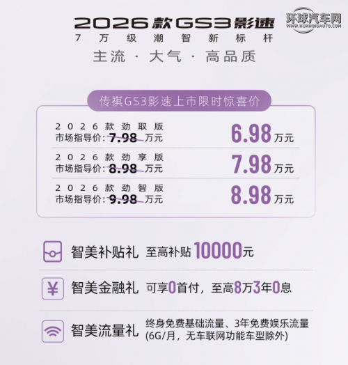 10月27日,7萬級潮智新標桿2026款傳祺GS3影速正式上市!新車共推出3個版本,官方指導價為7.98~ 9.98萬元,限時驚喜價6.98萬元起,可疊加至高8萬3年0息金融政策,用戶可以輕松上車。