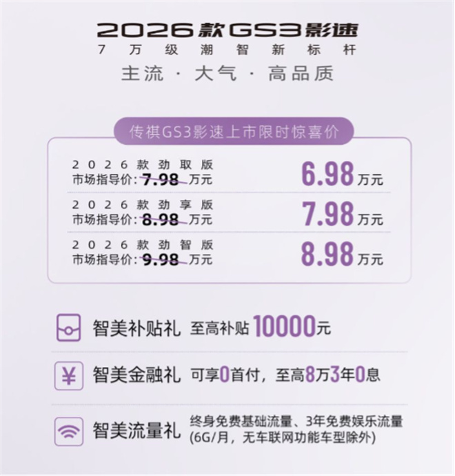 10月27日,7萬級潮智新標(biāo)桿2026款傳祺GS3影速正式上市!新車共推出3個版本,官方指導(dǎo)價為7.98~ 9.98萬元,限時驚喜價6.98萬元起,可疊加至高8萬3年0息金融政策,用戶可以輕松上車。