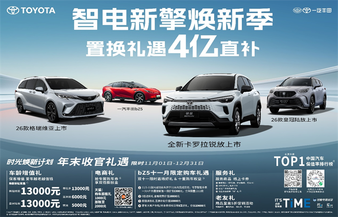 不止如此,為回饋用戶厚愛,一汽豐田年末收官禮遇再升級,以4億元廠家直補(bǔ)正式開啟“智電新擎煥新季”。11月1日-12月31日,皇冠陸放、格瑞維亞、普拉多等重磅車型可享至高1.3萬元的車齡增值禮;購全新bZ5更有限時購車福利贈送,此外“煥新季”還準(zhǔn)備了電商禮、老友禮、服務(wù)禮等多重大禮,以極致誠意為用戶創(chuàng)造最佳購車時機(jī)。