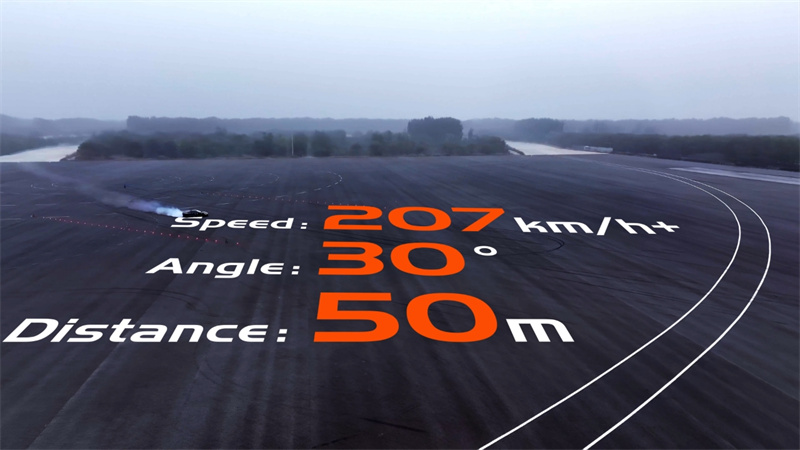 純電車型受載重及技術特性限制,高速漂移難度遠超傳統燃油性能車。此次挑戰要求昊鉑SSR保持160km/h以上漂移速度及大于30度漂移夾角的長時間穩定姿態。昊鉑SSR搭載首創兩檔四合一高性能電機,動力系統效率達94.5%,峰值扭矩12000N?m,最大馬力1224匹,零百加速僅1.9秒,可滿足漂移瞬間動力需求與漂移姿態維持;其配備的高端碳化硅芯片功耗降低80%,可有效克服電池與電機高溫保護限制,保障大功率輸出下的漂移穩定性,為長距離漂移提供持續動力支撐。