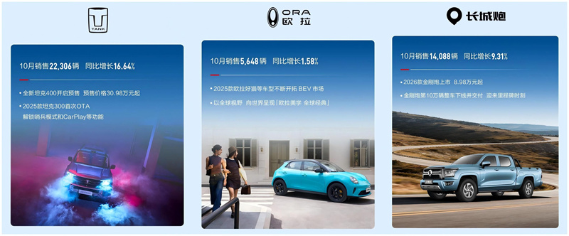 坦克品牌10月銷售22,306輛,同比增長16.64%,全新坦克400于10月開啟預售,搭載Coffee OS3智能系統與高通驍龍8295芯片,配備全場景NOA智駕功能,為后續增長注入強勁動力。長城皮卡10月銷售14,088輛,同比增長9.31%,2026款金剛炮上市當月便迎來第10萬輛下線的里程碑,性價比優勢凸顯。