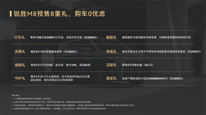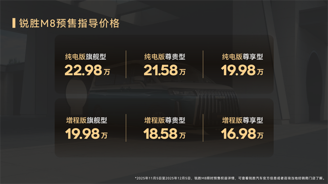 預售期間,下訂用戶可尊享價值至高2.98萬元的八項專屬好禮。銳勝M8計劃提供7座和9座兩種座椅布局,第二排為雙獨立式座椅,具備電動調節和腿托等功能。