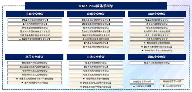 2025年,“技術驅動”與“全球化”成為中國新能源汽車行業的關鍵詞,考慮到消費者在實際用車過程中的復雜工況,NESTA 2026版引入多工況串行測試方案,從而更好地支持企業優化開發節奏、提升電安全品質。在2025版基礎上,NESTA 2026版優化、合并5個驗證項目,并基于行業發展需求新增多個測試內容,形成11個必選項,27個可選項的體系框架,以滿足企業多樣化、場景化的技術驗證需求。