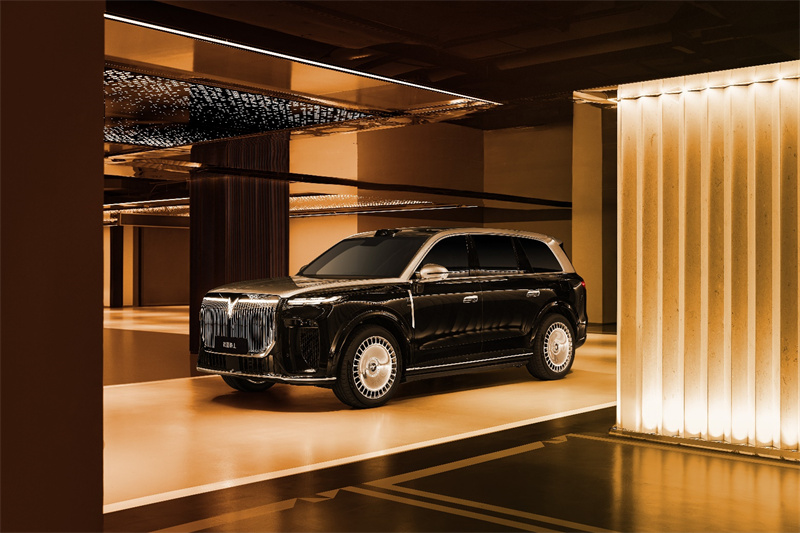 而令其在發運途中便自成焦點的,則是其磅礴氣韻與東方美學設計。車身超5.2米、寬超2米,呈現出“山海萬壑”般的磅礴體態。前臉34根光瀑華柱格柵與“天地之鏡”輪轂,靜止時如收納蒼穹,行進時盡顯王者姿態。細節處,“日月同輝”大燈、“山海倒影”尾燈,以及門把手上的“流光星辰”點陣,皆在方寸間植入東方意象,向世界宣告:中式豪華,自有其道。