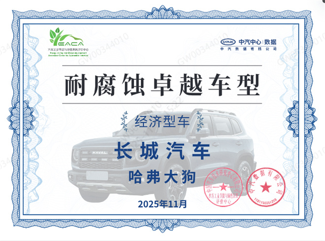 近日,中國汽車技術(shù)研究中心有限公司(以下簡稱“中汽中心”)發(fā)布的《2025年中國汽車耐蝕質(zhì)量研究成果》顯示,哈弗大狗以優(yōu)異的車身防銹數(shù)據(jù)和硬核技術(shù)表現(xiàn),成功贏得“耐腐蝕卓越車型”獎項。這是繼2024年斬獲“卷之有道全鋅車型”之后,哈弗大狗再度入選該項目年度典型案例,也是本次經(jīng)濟型用車組唯一獲獎車型。展示了長城汽車在車身用料、防腐技術(shù)以及造車底蘊上的核心競爭力。