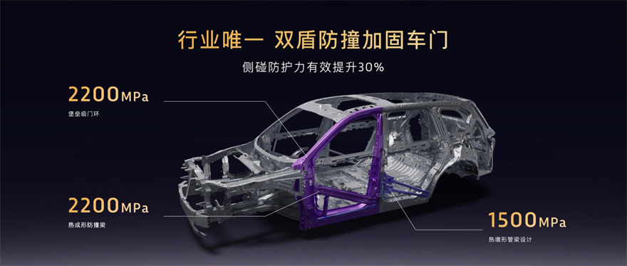 一直以來嵐圖始終認為,安全是最大的豪華。嵐圖泰山具備行業領先的高強度鋼鋁混合豪華車身,關鍵防護部位更采用24.5%頂級熱成形鋼,更使用行業唯一的雙盾防撞加固車門,將車門剛度從2000MPa提升至2200MPa,做到行業目前最高的標準。2200MPa車門防撞梁與一體式門環,可使無論意外來自何方,都能最大程度抵御沖擊,實現行業領先的頂級全車乘員保護。