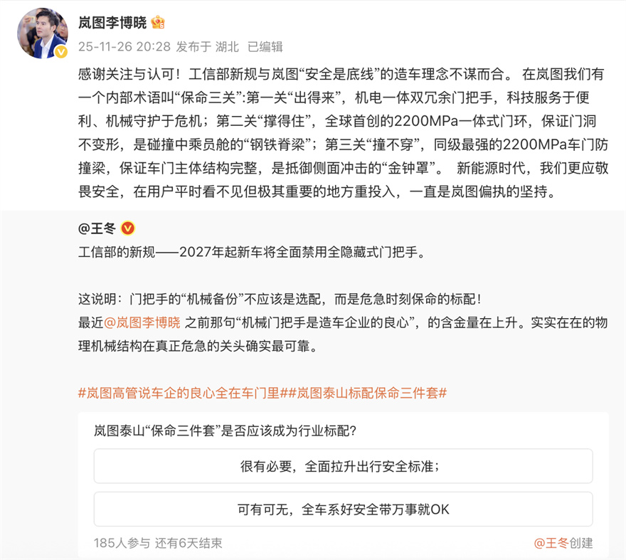 別人還在拼顏值搞花活,嵐圖卻早已成為了清醒派!近日,嵐圖銷售公司副總經理李博曉在與網友互動中再次表示,在嵐圖內部有一個為用戶打造的“保命三關”,有些用戶平時看不見的地方,正是嵐圖最偏執的堅持。這話直接戳中網友!嵐圖泰山“保命三件套”一時引發廣泛關注。