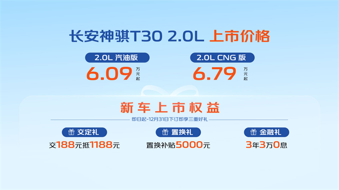 11月27日,“強芯進階 不懼重載”長安神騏T30 2.0L全國聯動上市。新車共推出2.0L汽油和CNG兩種動力版本,官方指導價6.09萬元起,即日起至12月31日下訂即享三大新車上市權益。
