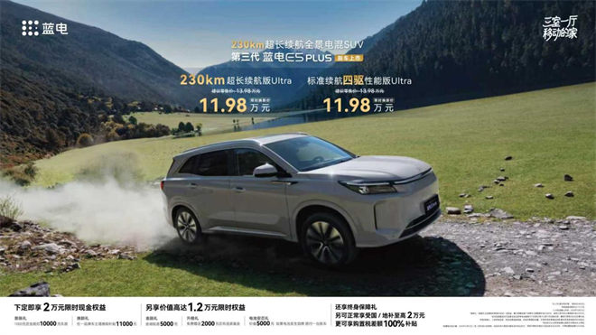 12月3日,第三代藍電E5 PLUS正式上市。新車憑借“12萬內唯一230km超長純電續航”、“15萬內唯一電混全時四驅”、行業首創的“輪上三室一廳”場景生態,以及“深度融合豆包大模型的智能座艙”四大差異化優勢,為用戶打造出全新的場景化出行體驗。新車推出230km超長續航版Ultra與標準續航四驅性能版Ultra兩款車型,實現“入門即頂配”,兩款車型官方指導價均為13.98萬元,限時換新價僅11.98萬元。購車用戶另可享1.2萬元限時權益,并正常享國家及地方至高2萬元補貼;同時,更享2025年12月31日前購置稅差額100%補貼,以十足誠意讓全場景高品質出行惠及更多家庭。