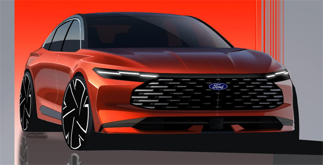福特新蒙迪歐融合美式運動基因與大氣設計語言,呈現出兼具優雅與力量感的外觀造型。新車前臉采用“低趴寬體”設計,壓低車頭、拉伸視覺寬度,配合俯沖式下沉線條與修長大燈,強化動感姿態。