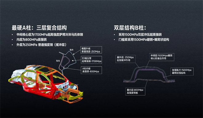 安全是底線,福特始終堅持“質量不妥協、安全不妥協、性能不妥協”。福特新蒙迪歐采用超強籠式車身,車身結構全面強化,600MPa以上高強度鋼占比提升至53%;A柱采用1700MPa超高強度薩博冷淬馬氏體鋼三層復合結構,搭配B柱1500MPa雙層沖壓超高強鋼,協同提升抗變形能力,進一步強化車身整體剛性。福特新蒙迪歐依靠「鋼筋鐵骨」打造出遠超同級的安全座艙,配合Co-Pilot 360™駕駛輔助系統,涵蓋ACC全速自適應巡航、PCA防碰撞輔助等多項主動安全功能,為用戶構筑全方位安全防護。