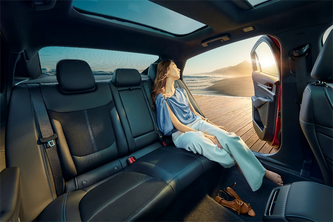 福特新蒙迪歐以近5米車長與2945mm軸距打造出二排近1米的“大五座”腿部空間,配合0.94㎡超大全景天窗、丹麥B&O音響與吸入式座椅通風加熱系統,營造出移動的“豪華大平層”。后排座椅支持多擋位調節與放倒,后備箱空間可在520L至1550L之間自由切換,滿足家庭出行與休閑旅行的多元需求。