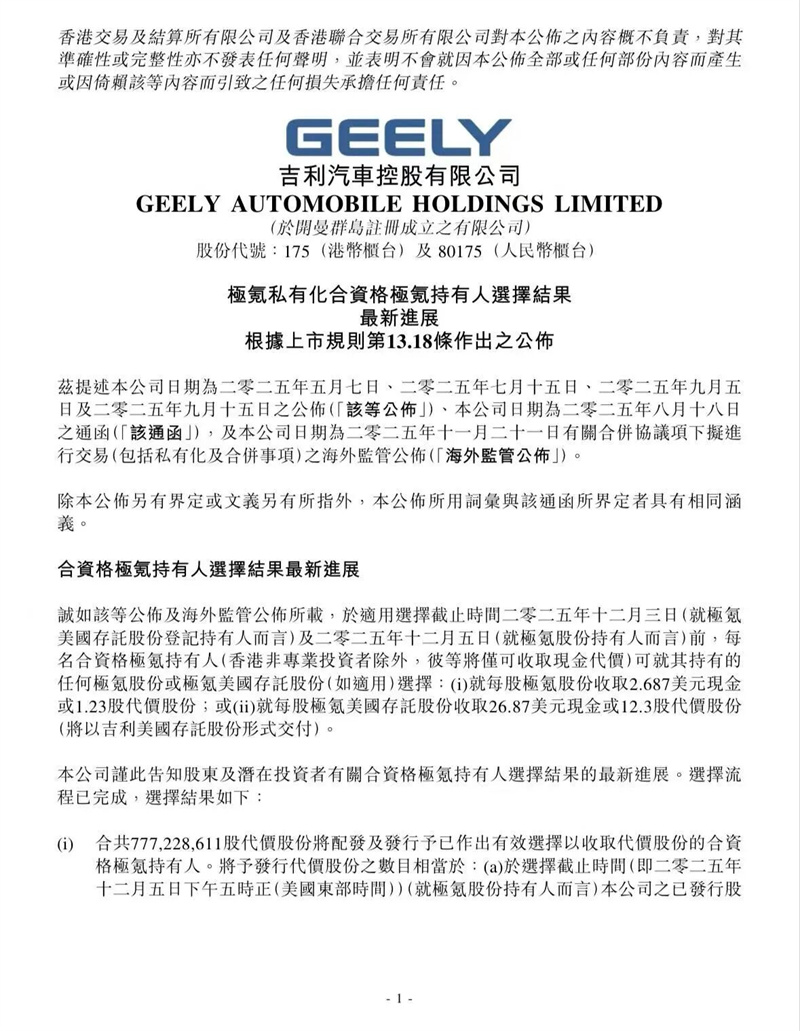 選擇股份對價的極氪持有人占合資格極氪持有人約70.8%,吉利汽車將為其配發及發行共計777,228,611股對價股份。該對價股份與吉利汽車已發行股份享有同等權利,包括股息分配、投票權和資本回報等。選擇或被視為選擇現金對價的極氪持有人,占合資格極氪持有人約29.2%,吉利汽車將支付合計約7.01億美元的現金款項。