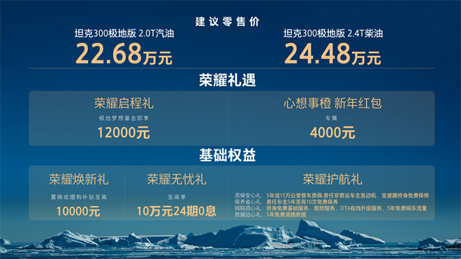 2025年12月11日,在坦克300全球用戶突破50萬(wàn)的歷史性時(shí)刻,坦克300極地版正式上市。這款新車型提供2.0T汽油和2.4T柴油兩個(gè)版本,售價(jià)分別為22.68萬(wàn)元和24.48萬(wàn)元。