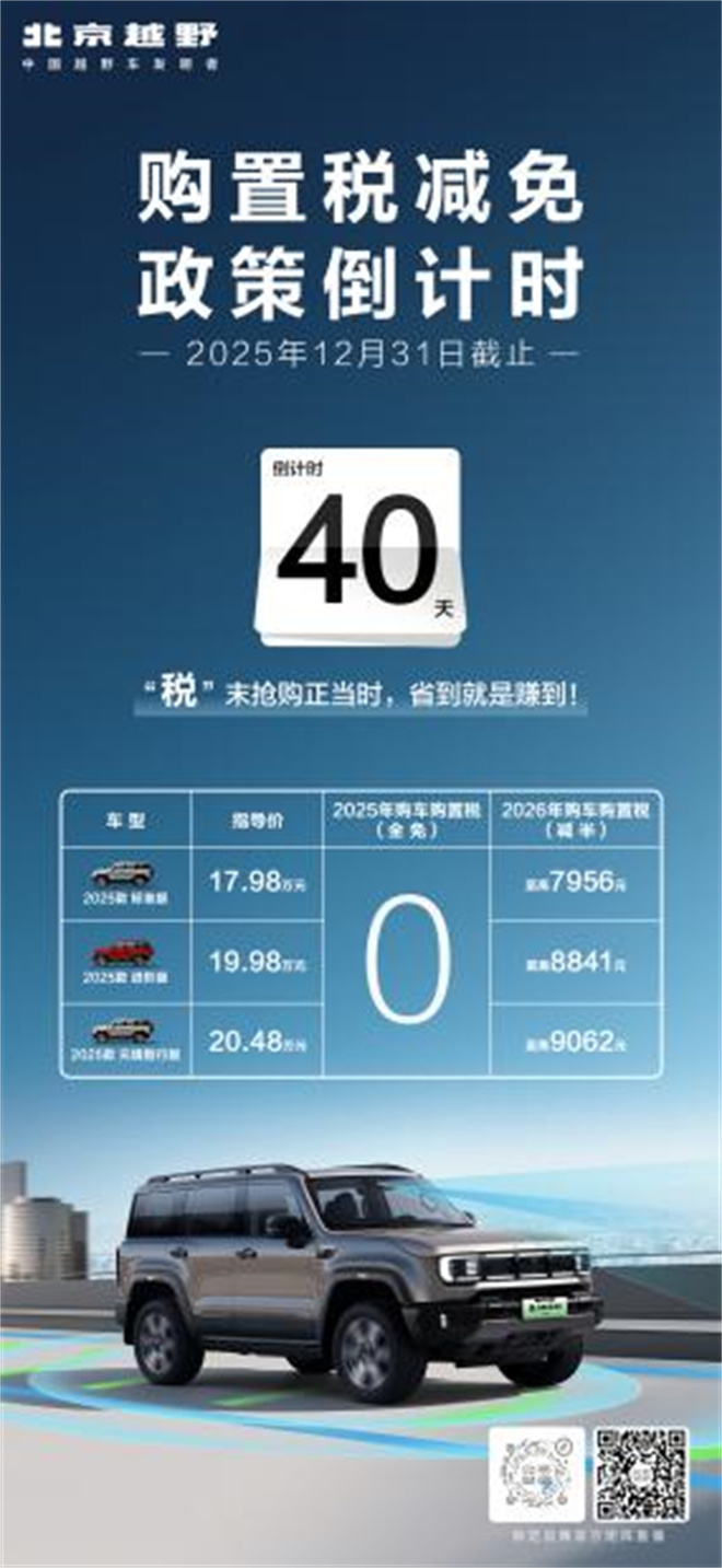 對(duì)于消費(fèi)者來說,當(dāng)前選購BJ40增程的理由不僅因?yàn)槠溆埠水a(chǎn)品實(shí)力,還有一重政策原因。根據(jù)政策規(guī)定,對(duì)購置日期在2024年1月1日至2025年12月31日期間的新能源汽車免征車輛購置稅。自2026年1月1日起,新能源汽車購置稅將調(diào)整為減半征收。2025年剩余時(shí)間已成為能夠享受購置稅全面優(yōu)惠、節(jié)省購車成本的最后黃金期。