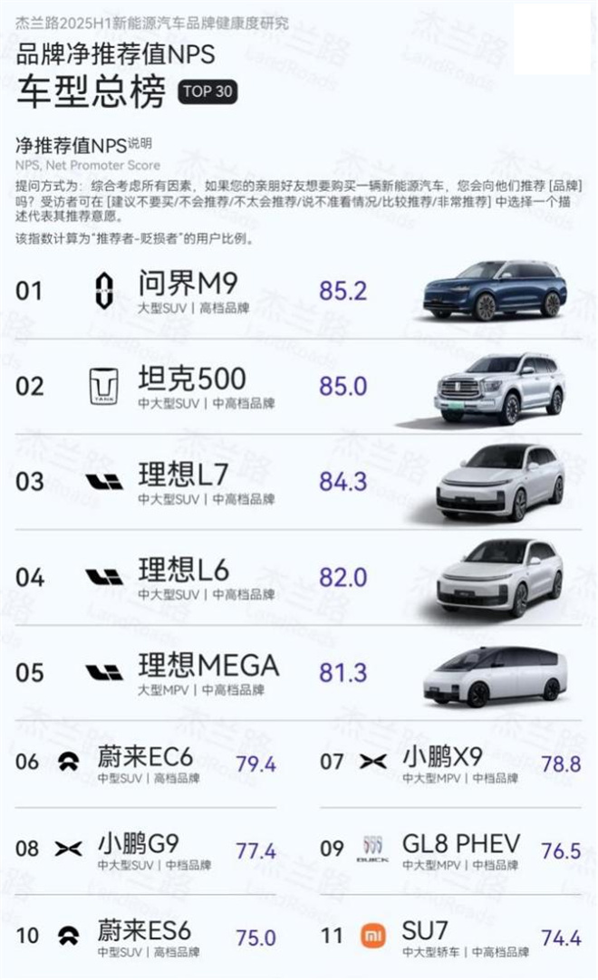 扎實的技術底氣最終要轉(zhuǎn)化為市場認可,而鴻蒙智行在這方面的表現(xiàn)同樣令人印象深刻。根據(jù)杰蘭路《2025年度上半年新能源汽車品牌健康度研究》,問界品牌位居品牌發(fā)展信心指數(shù)榜首,其旗艦車型問界M9更是以85.2分的高分奪得新能源車型凈推薦值(NPS)總榜第一名。