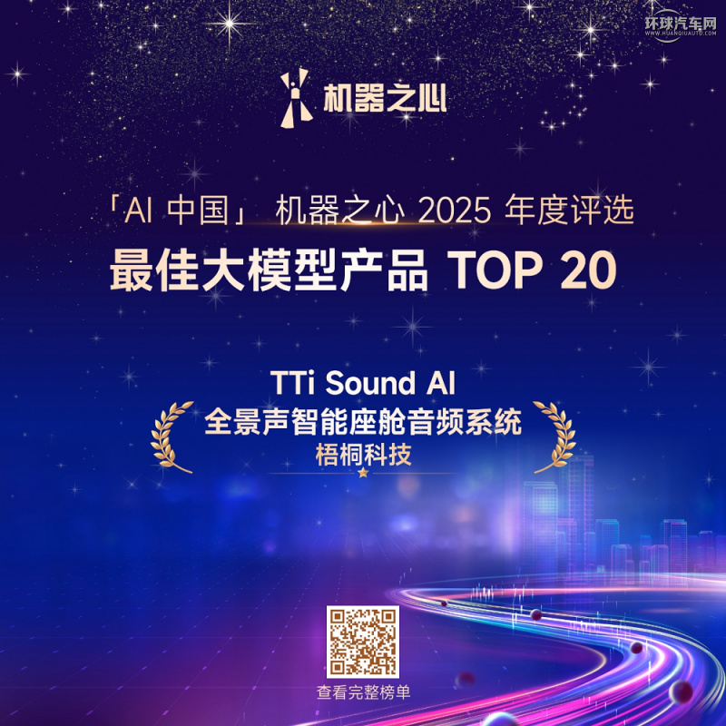 12月31日,「AI中國」機器之心2025年度評選正式揭曉,梧桐車聯科技有限公司(以下簡稱“TINNOVE梧桐科技”)旗下TTi Sound AI全景聲智能座艙音頻系統成功入選“最佳大模型產品TOP20”。該產品作為行業首發的由大模型驅動的車載音頻方案,重塑座艙內聽音體驗,成為智能座艙領域AI大模型落地的典型代表。