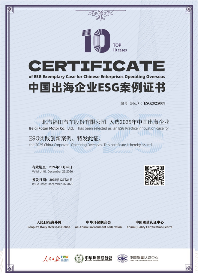 12月26日,由人民日報海外網、中華環保聯合會主辦,中國質量認證中心聯合主辦的“第三屆中國品牌形象海外傳播論壇暨2025中國企業ESG藍皮書發布會”在人民日報社舉行。憑借在ESG領域的卓越實踐與全球市場的責任踐行,北汽福田成功入選“2025年中國出海企業ESG實踐創新案例”TOP10,標志著北汽福田ESG實踐再獲權威認可。