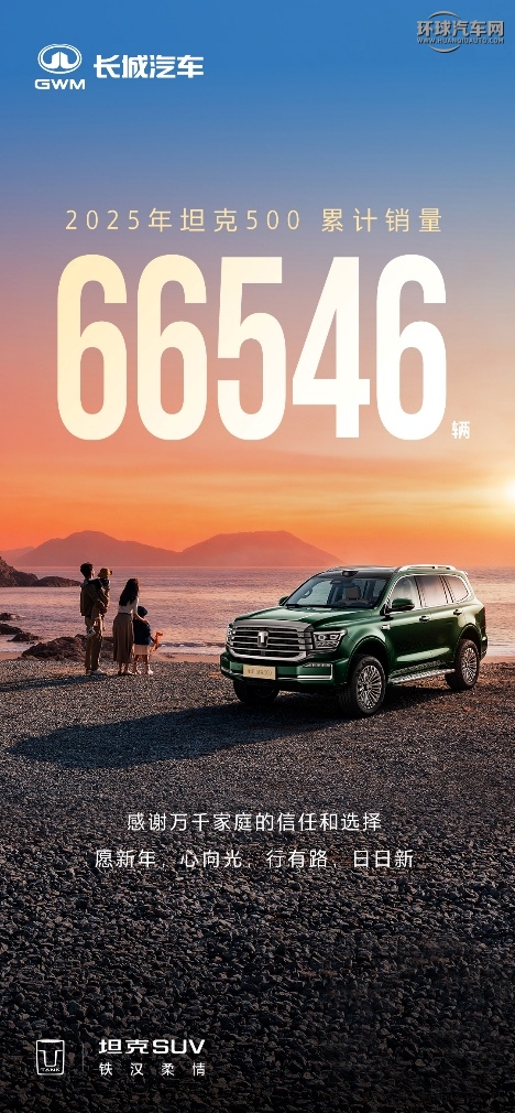 2025年全年銷量66546輛是坦克500市場成功的重要里程碑,更是中國品牌高端突破的范本。在行業變革的浪潮中坦克500以技術底蘊為根、場景洞察為軸、文化自信為魂,構建起可持續的豪華價值體系。未來,坦克500將以豪華越野標桿之姿,繼續開拓更廣闊的市場疆域,引領中國汽車行業在全球豪華越野版圖上全面布局。
