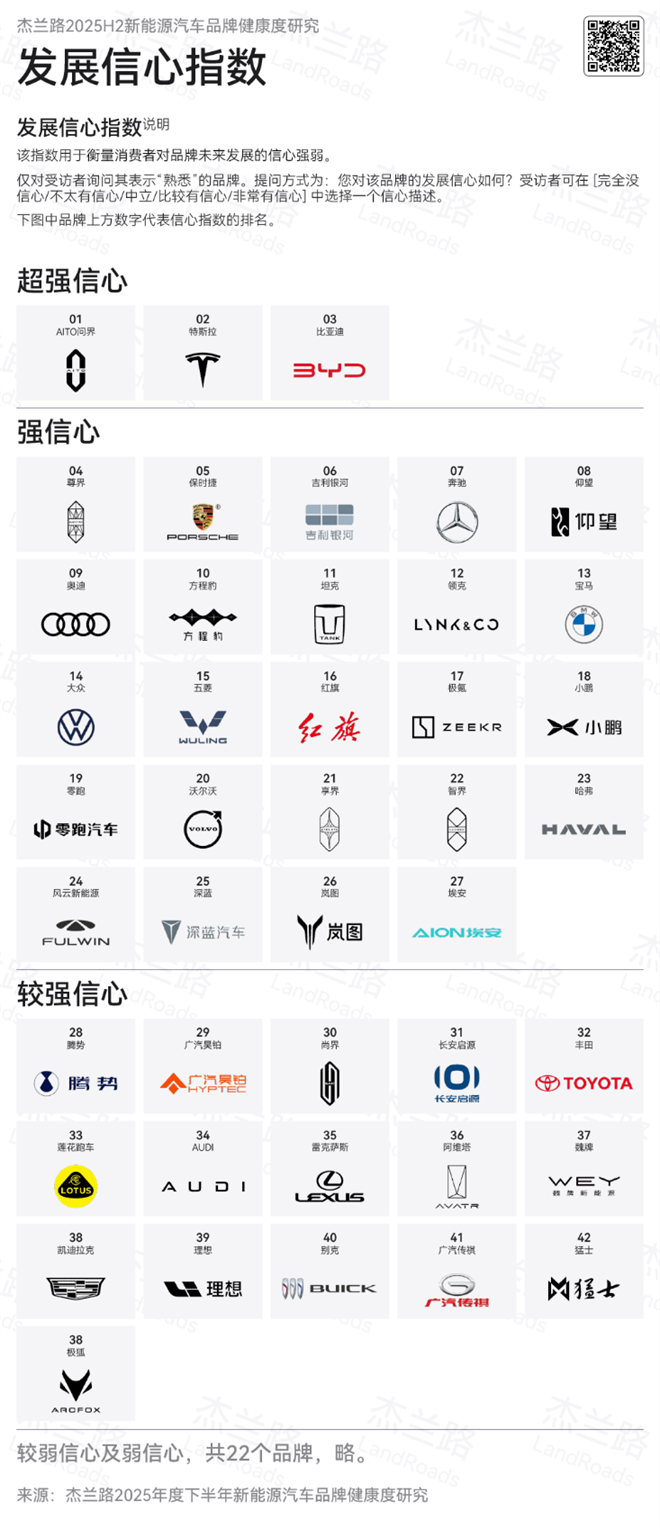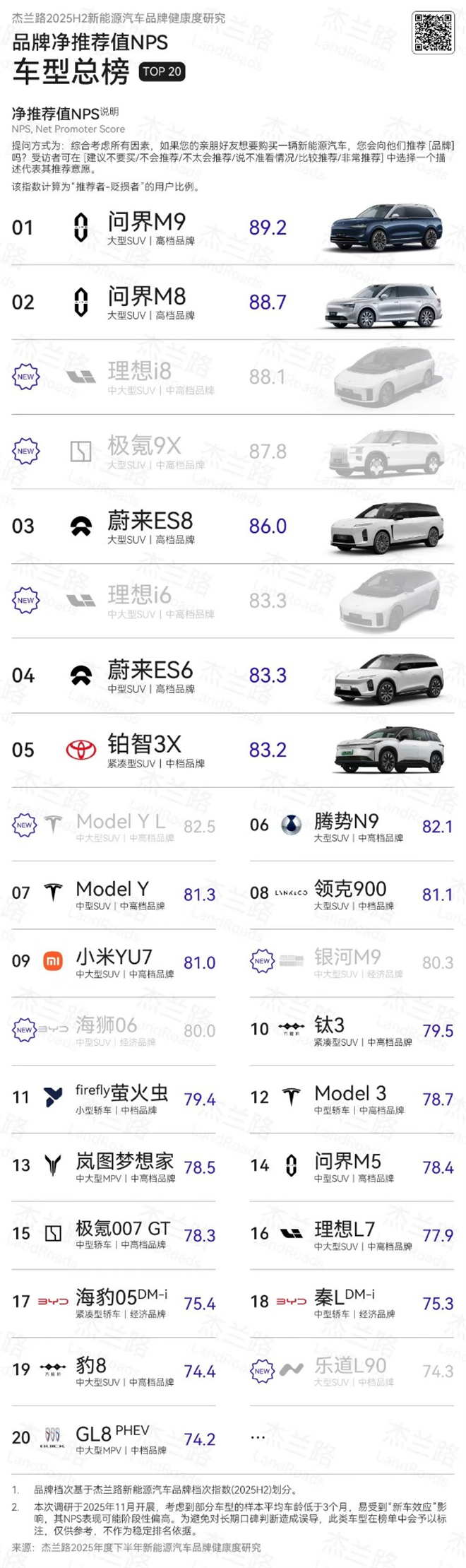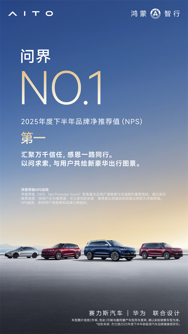 近日,杰蘭路咨詢發布《2025下半年新能源汽車品牌健康研究報告》。報告顯示,問界榮獲品牌NPS(凈推薦值)第一、品牌發展信心指數第一、30萬元以上品牌百人青睞指數第一;問界旗下“雙旗艦王牌”,再添口碑佳績:全景智慧旗艦SUV問界M9榮獲車型NPS (凈推薦值) 第一,家庭智慧旗艦SUV問界M8首次參評即榮獲NPS (凈推薦值) 第二。這一系列亮眼成績,無不彰顯問界在高端新能源賽道的引領地位。
